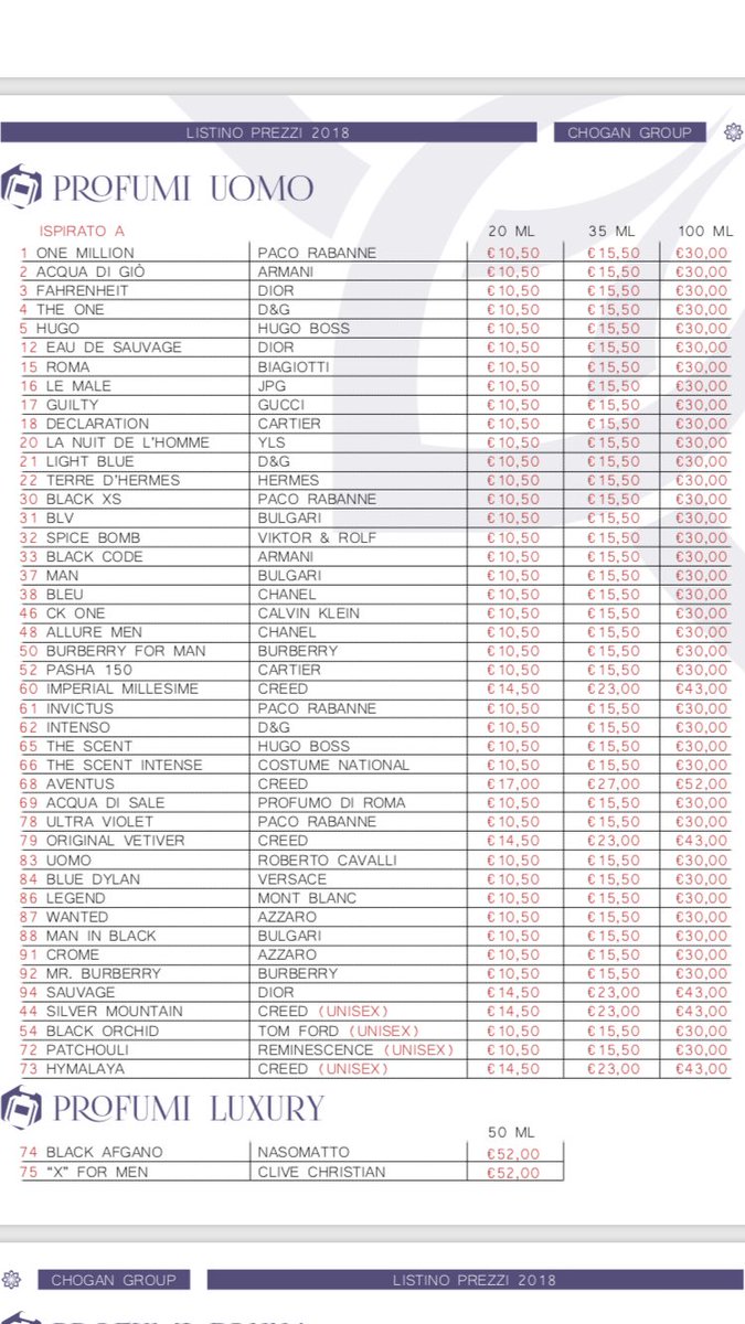 Inizialmente trattava solo profumi ma ora ha aggiunto tantissimi prodotti creme make up detergenti per la casa che non contengono allergeni e parabeni non testati su animali e tutti certificati. Chogan group listino prezzi 2017 profumi uomo linea luxury. Chogan e unazienda che produce tantissimi prodotti che vanno dalla cura del corpo e della casa ai nostri amici animali e anche ai profumi.